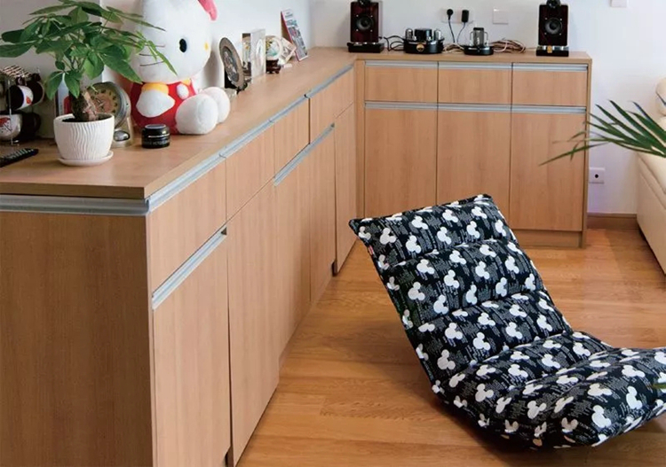 在装书柜时,业主要求把书柜做到最顶层,靠着顶墙,便有了客厅中颇具风格的及顶书柜。这套书柜的储存空间很大,总体呈“L”形,分三部分,上面是有三层书架的书柜、中间是镂空的装饰区,下面是储存区。整套书柜不仅可以放书,还可以摆设装饰品,收集物品,可谓一用多得。当初为了这套书柜,盛一还专门进行了定制,最终制作出了业主满意的效果。