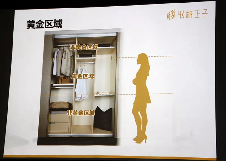 随后,收纳专家Melody老师讲解了衣柜、橱柜等的“黄金收纳区”,她介绍说,人保持战立的姿势即可触及的地方为黄金收纳区,该区域最应该收纳的是家人常用的物品。