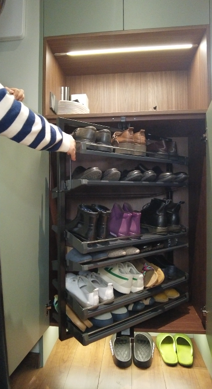 利用侧面空间可以设计各种组合鞋柜。松下的旋转鞋柜仅需一点空间即可容纳50双鞋。